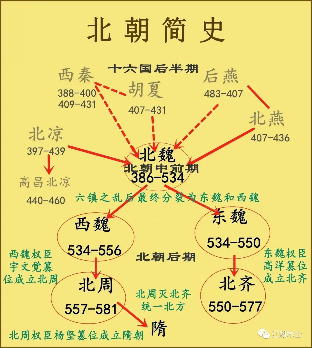 先是三国鼎立,魏、蜀、吴三分天下,各方势力你争我夺。而后西晋短暂统一,可很快又因八王之乱等诸多问题,走向衰落,进而导致北方少数民族纷纷南下,出现了 “五胡十六国” 的混战局面。南方则有东晋偏安一隅,后续又历经宋、齐、梁、陈等朝代更替。北方同样不平静,鲜卑拓跋部建立北魏统一北方一段时间后,又分裂为东魏、西魏,再演变为北齐、北周。