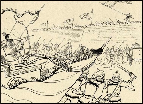 守城的兵丁慌了手脚,连忙发箭投石。但是颍考叔没有退缩,顺势一跃,早登上了城墙。守城兵士都吓得纷纷倒退。颍考叔刚站稳脚步,正待回身招呼大军向前,谁知子都又妒又恨,偷偷取出弓箭,咬咬牙,对准颍考叔嗖地射去。