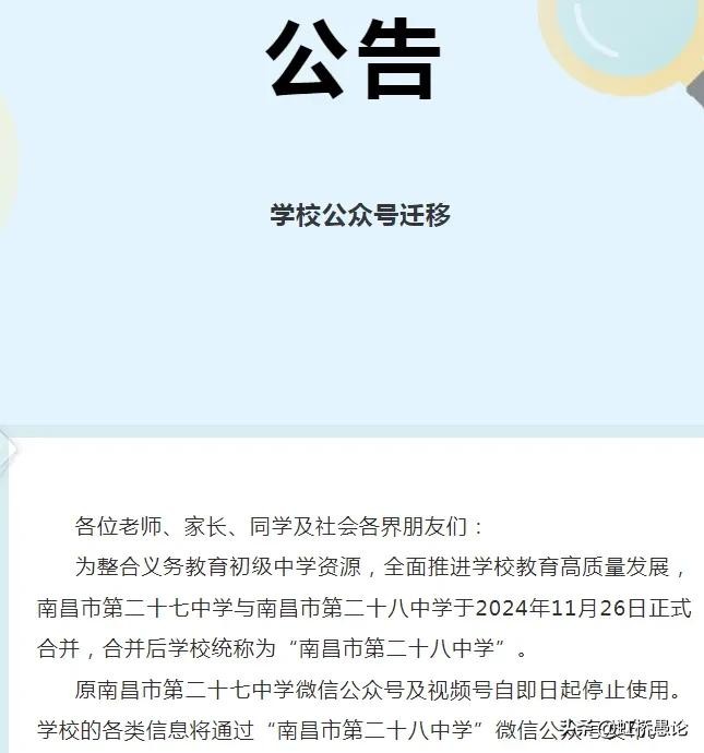 再往前,12月17日,南昌二十七中也发布公告,停用公众号和视频号,一切对外宣传,以南昌市二十八中为准,也正式宣告,南昌市二十七中正式退出历史舞台!