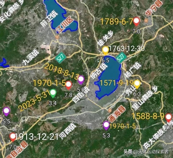 1500年1月13日宜良7级地震震中距11月27日3级地震震中30多公里。