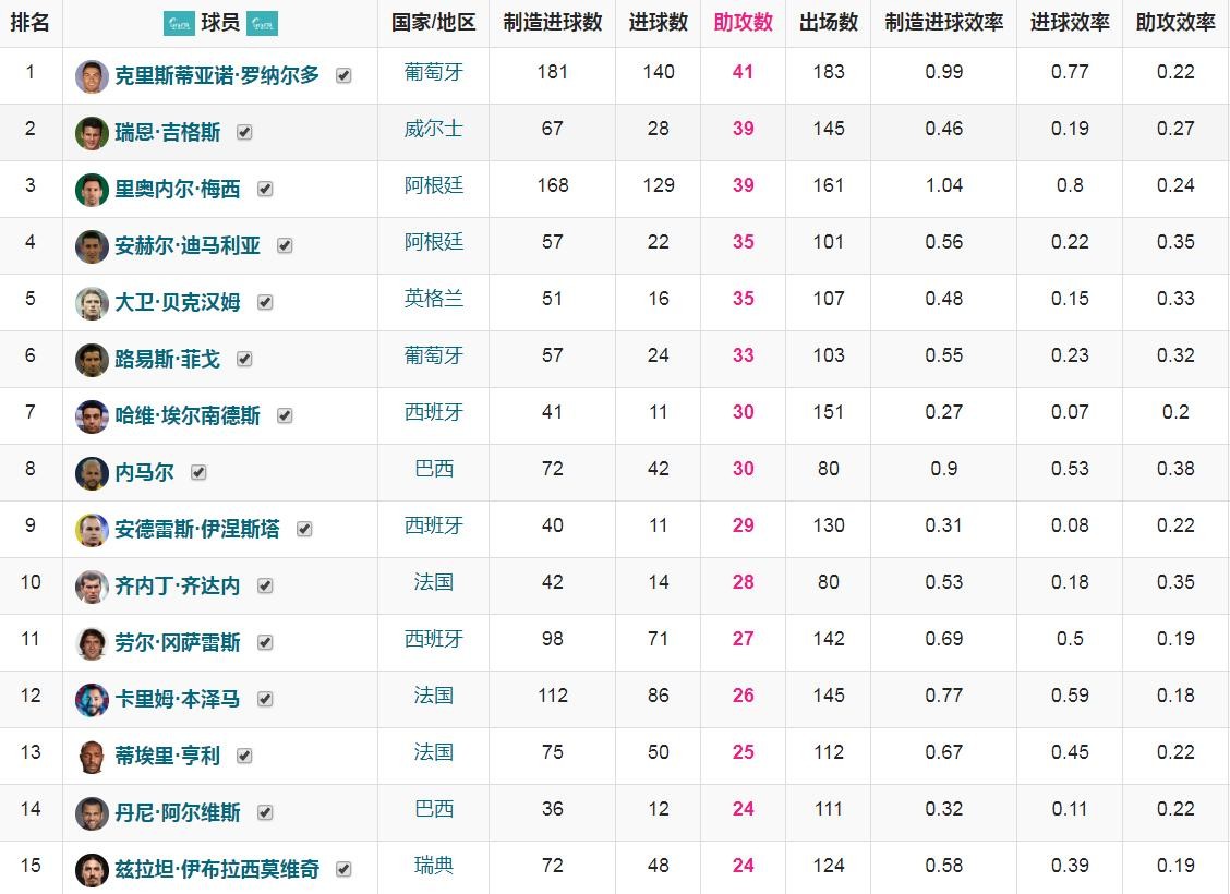 现役球员中,除了上述几位排名最高的是今年的金球奖得主本泽马,他以26次助攻排名历史第12名。