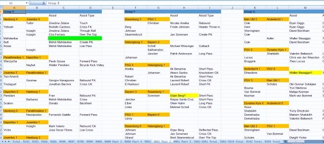 在卷帙浩繁的历史视频资料和各个国家的报纸和杂志的比赛战报资料中,M君足足花了一年多时间,完成了这个阶段的数据统计工作。他的表格之前也公开分享在了中文互联网上,这份表格做的有多么细致呢?他将那十年的每一场比赛,每一个进球,是谁助攻谁,是通过什么方式助攻的,全部都列了出来。