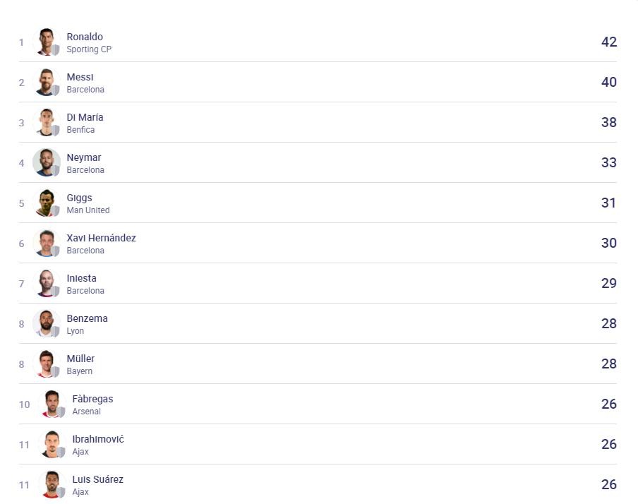 最后,我找到了欧足联官网上的欧冠历史助攻榜: