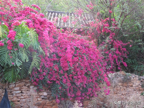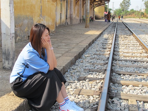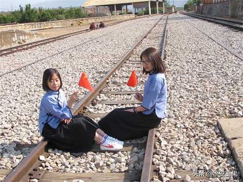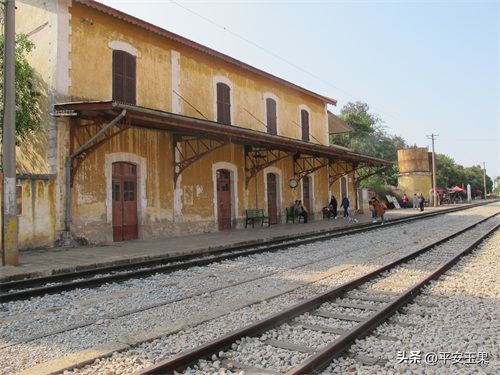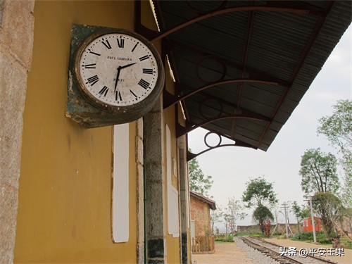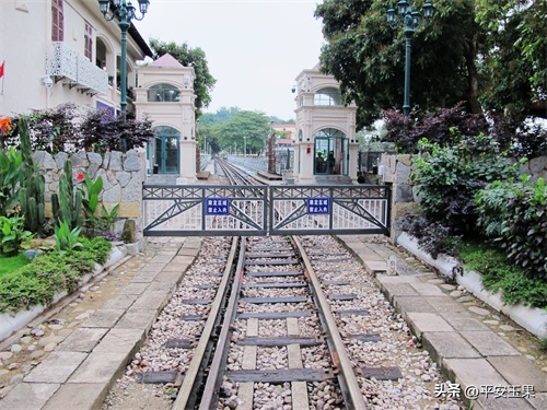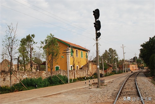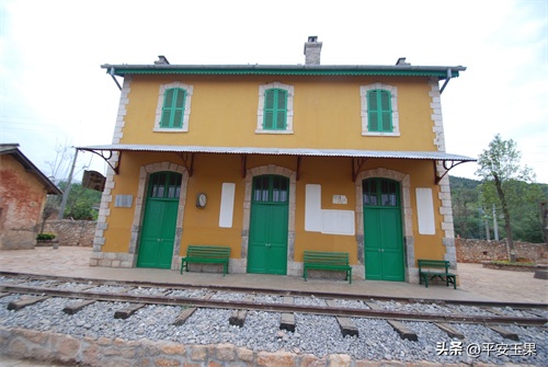 阳光下,山坡上土砖土瓦的民房高低错落地掩映在绿树和怒放的粉红色三角梅下,一座山脊型黄色涂壁的法式火车站房静立一隅,交错的几组铁轨向远划出了黑色曲线。
