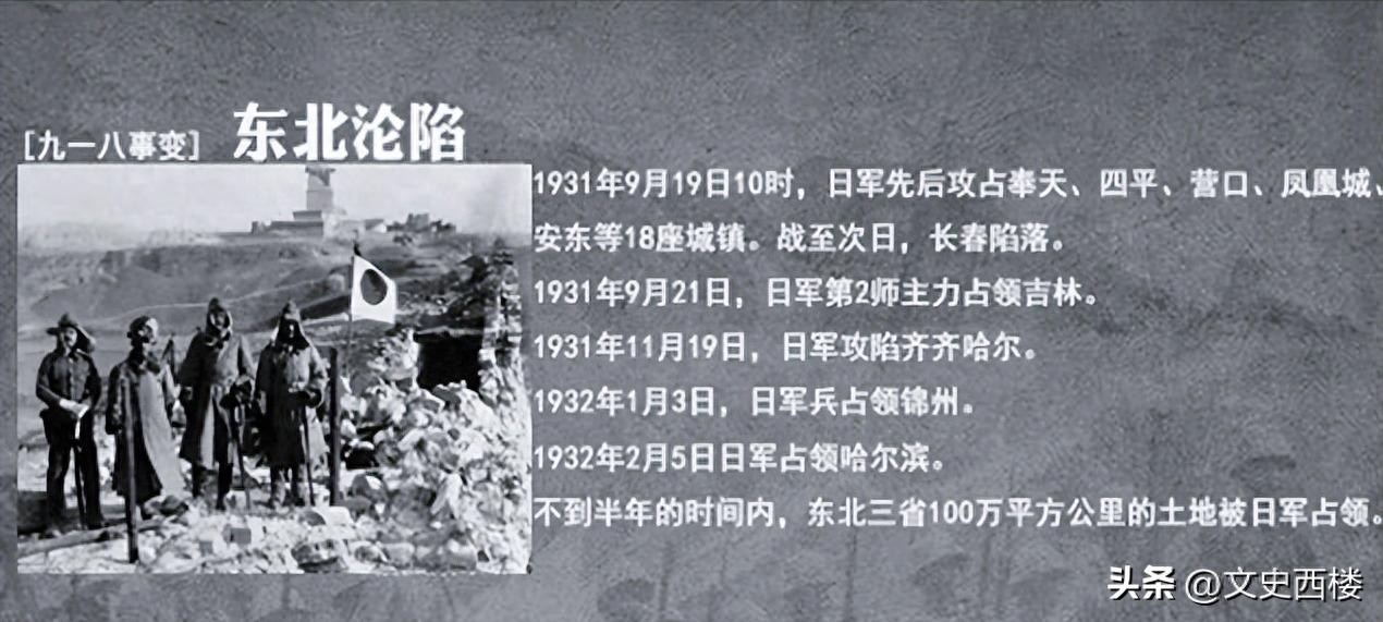 1931年9月18日夜,盘踞在东北的日本关东军,按精心策划好的阴谋,将沈阳柳条湖附近的南满铁路的一段铁轨炸毁,并栽赃嫁祸于中国军队。日军以此为借口,炮轰沈阳北大营。次日,日军侵占了沈阳,继而进攻锦州。驻锦州的东北军第12、第20旅和骑兵第3旅奉张学良命撤退至河北滦东地区和热河,日军兵不血刃就占领锦州。1932年2月,在不到半年的时间,东北三省全部沦陷。此后,日本在东北建立了伪满洲国傀儡政权,扶持清朝末代皇帝溥仪上位,开始了对东北人民长达14年的奴役和殖民统治。