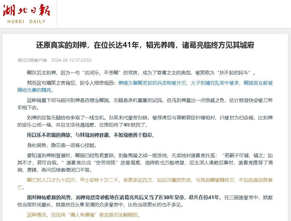 2、原文刊登于湖北日报2024-04-12发布的关于《还原真实的刘禅,在位长达41年,韬光养晦,诸葛亮临终方见其城府》的报道;