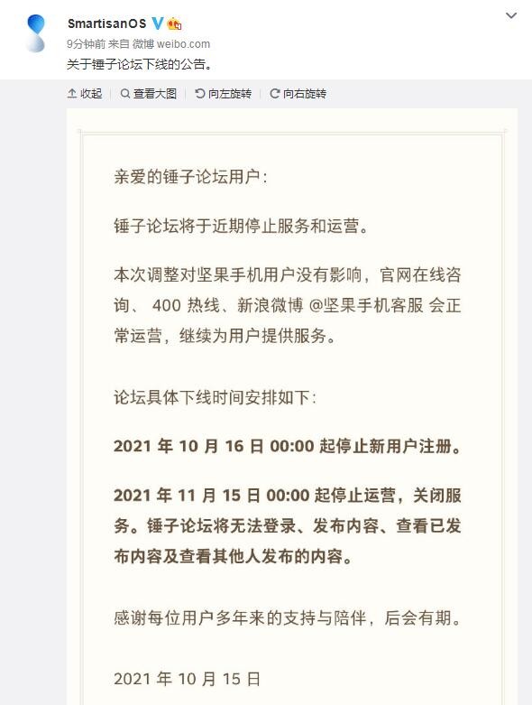 2021年10月15号起,Smartisan OS官方发布正式下线了“锤子论坛”,用户将无法登录、发布内容、查看已发布内容及查看他人发布内容。