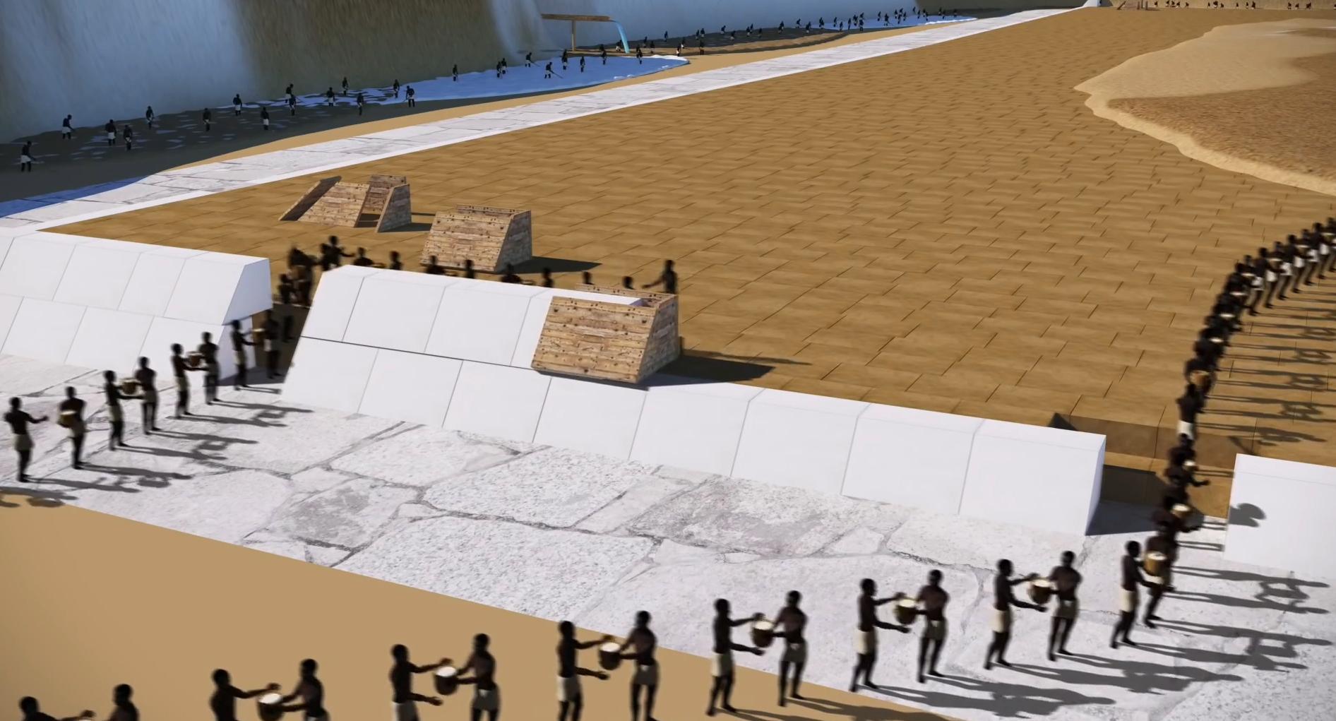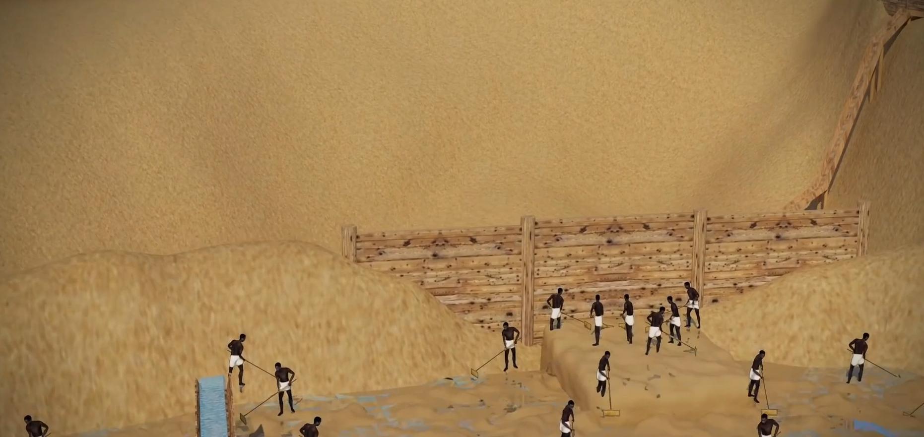 于是他们将时间定在了尼罗河洪水开始,清晨洪水到达山脚,早已等待的工人利用螺杆泵将水运向制造混泥土区。