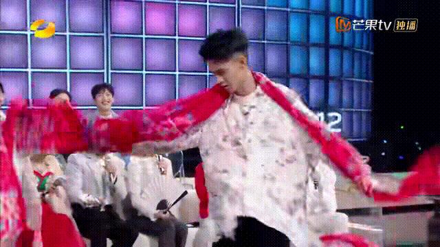 李玉刚表演完后,何炅让秦霄贤来试一段,秦霄贤努力地记着动作,结果上绸缎的时候,转着转着就头晕了,分不清东南西北的。