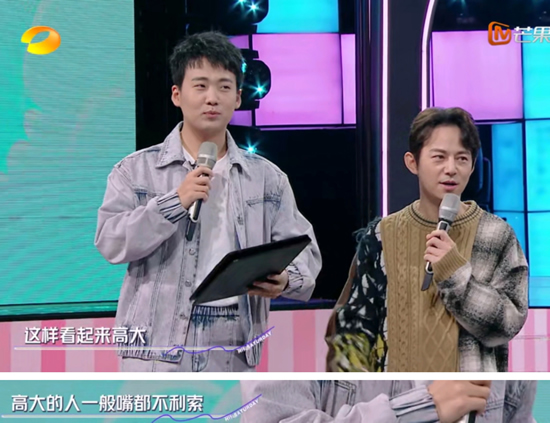第二个游戏是对口型,何炅让郭麒麟站台上来表演对口型,开玩笑地说这样看起来高大。结果郭麒麟来了句:高大的人嘴都不利索。