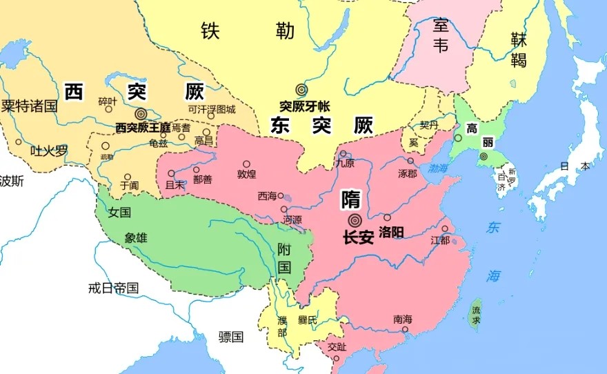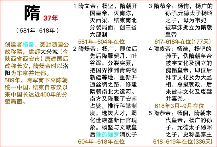隋朝(581年-618年):是中国历史上继南北朝之后的统一王朝,享国38年。581年,杨坚代北周称帝,国号隋,是为隋文帝,建都大兴城。589年,隋军南下灭陈朝,统一中国。