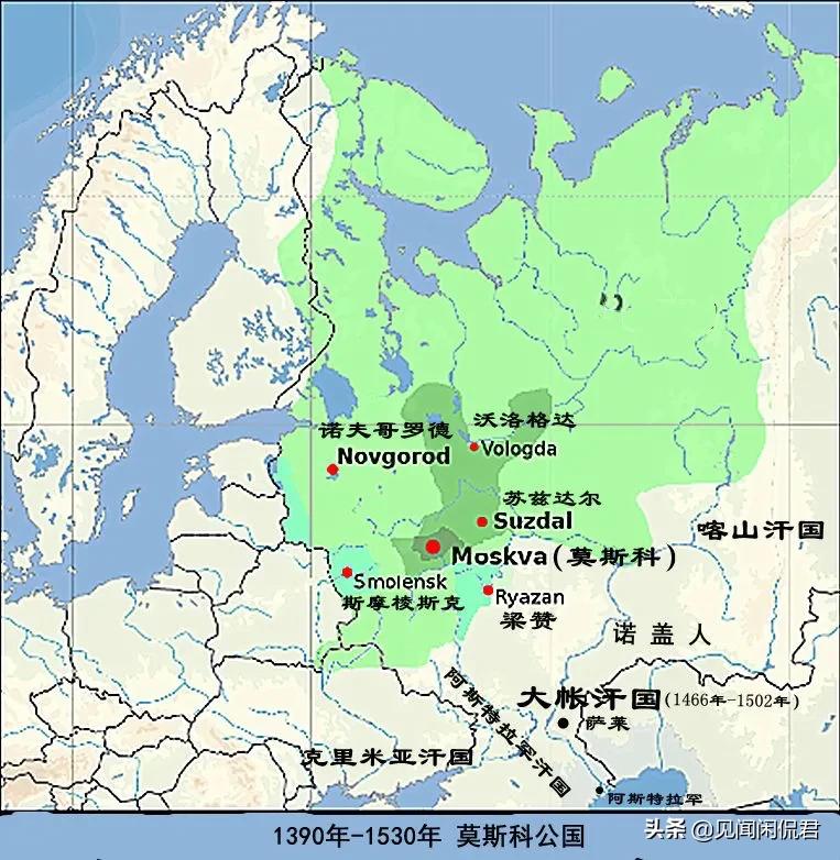 公元15世纪,金帐汗国衰落,莫斯科公国越来越强盛,对金帐汗国发动反击战,最后在公元1502年灭掉金帐汗国