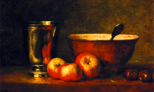 静物画是夏尔丹最喜爱的主题之一。他后期创作的静物画,均极其简朴。在夏尔丹的静物画中经常可以看到这只银杯,想必它是夏尔丹最珍惜的材物之一。