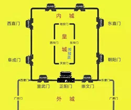 明清北京城有外城、内城、皇城、紫禁城(现故宫)四层,三道城墙,门很多,有“内九外七皇城四”的说法,即外城七座门、内城九座门、皇城四座门。皇城四门是天安门、地安门、东安门(东华门)、西安门(西华门)。