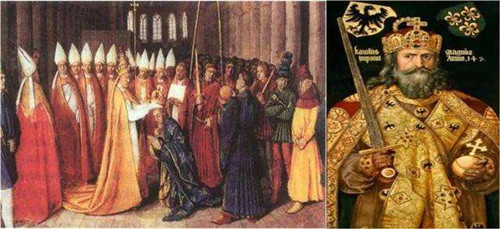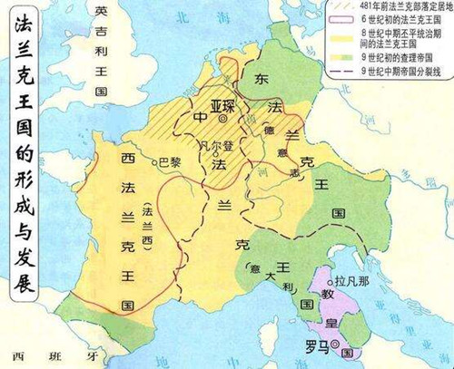 481年,克洛维继部落酋长后,开始全力扩张,战胜了匈人,柔然人(阿瓦尔人)和日耳曼部落等法兰克其他势力。486年击溃西罗马帝国在高卢的残余势力,占领高卢地区,建立了墨洛温王朝,以巴黎为都。751年,宫相矮子丕平篡夺王位,开始加洛林王朝的统治。丕平之子查理在位时大规模向外扩张。公元800年查理加冕称帝,成为查理曼帝国。