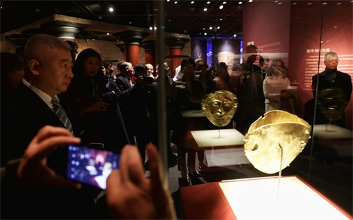 嘉宾在观看展出的“阿伽门农金面具”复制品。新京报记者 浦峰 摄