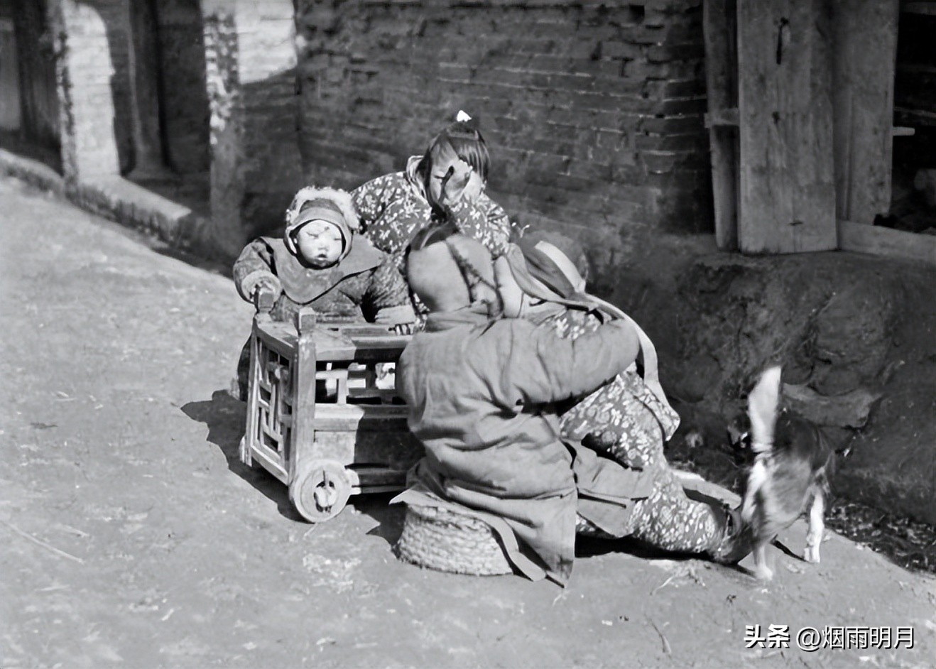 100多年前人们的生活场景,条件十分简陋,可能是因为夏天,一个小孩赤着脚,来回跑着玩耍。