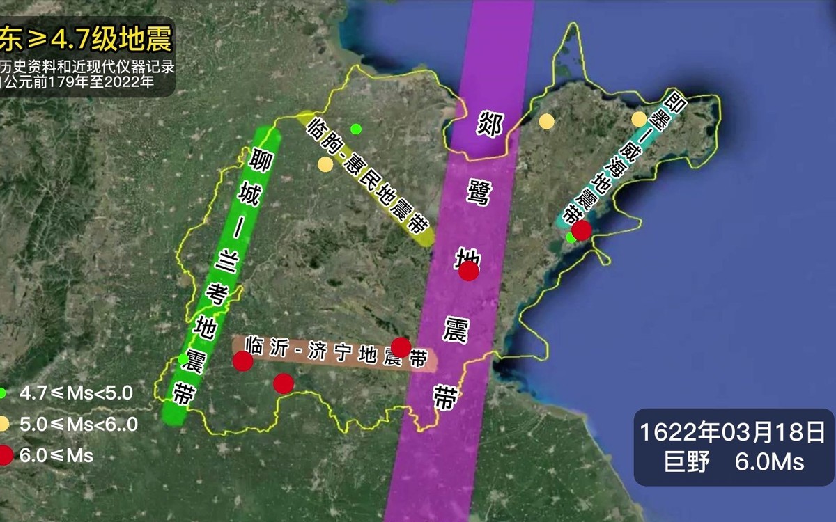 其中存在历史悠久的郯庐地震带是脾气最为“火爆”的,其北起黑龙江南至长江中下游地带,全长达到了2400公里。在这条地震带中,沈阳至宿迁阶段的中带是最为活跃的,也是6.0级别地震活动最为频繁的。而山东正好就位于最活跃的中带地段。