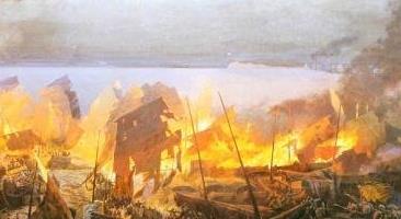 文聘和于禁站在指挥船上指挥大家砍断铁锁各自为战,但为时已晚,强劲的东南风将火势越刮越猛,无数曹军的舰船被淹没在火海当中。一时之间浓烟四起,火光冲天,人喊马嘶漫江嘈杂。水寨里的场面已然完全失控!张牙舞爪的火龙趁着风势大显其威,一船接着一船、一艘接着一艘地烧将过去,把它们烧得漏洞丛生,纷纷下沉。从江面上遥遥望来,水寨内外一片焰光,整个夜空都被映得炽红如炭!
