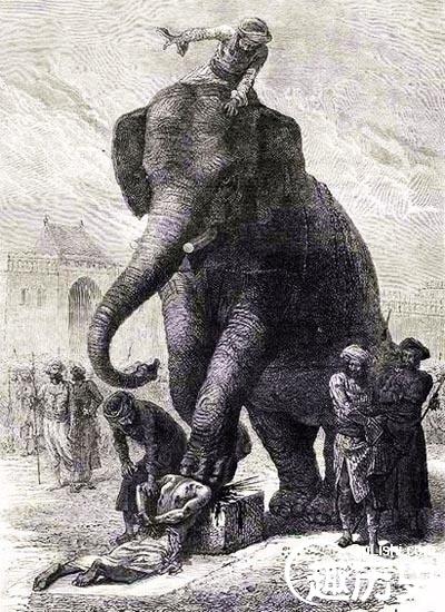 在南亚及东南亚,象刑已经存在几千年了。人们会训练动物执行两种形式的死刑,一种是慢慢地折磨致死,另一种是瞬间地碾死。
