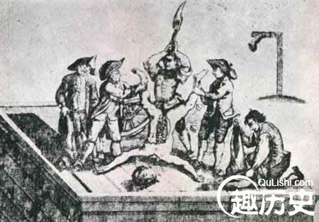 而后,受刑者会被勒住脖子悬吊一段时间,直至其几乎断气(绞刑)。再次,会对受刑者进行剖腹和阉割,其肠子和生殖器会在受刑者面前进行焚烧。