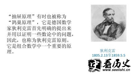 1834年提出鸽巢定理(即抽屉原理),当时命名为Schubfachprinzip (drawer principle)。