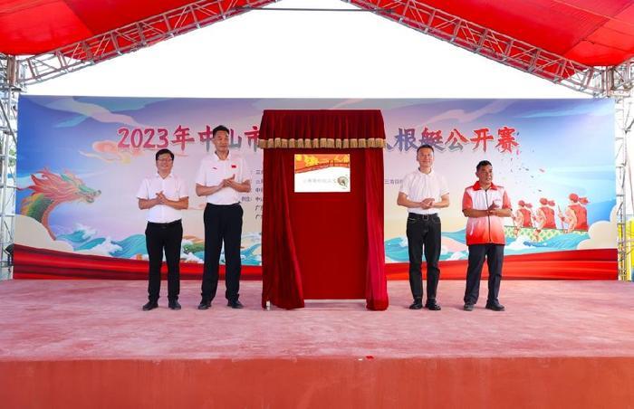 三角镇党委书记李宗,中山市教育工委委员、中山市教育和体育局党组成员、副局长陈威,三角镇党委副书记何永远,三角镇根艇协会会长李健球为根艇文化馆揭幕。