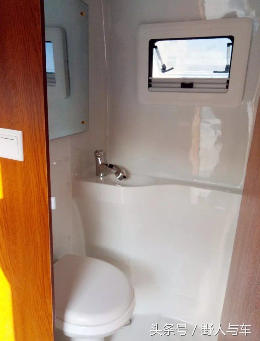 厨房对面则是一个独立的卫生间,卫生间内配备了洗手台盆和马桶。卫生间的空间比较紧凑只能容纳一人洗澡。整车配备了80L的清水箱和30L的污水箱以及40L的220V热水器。