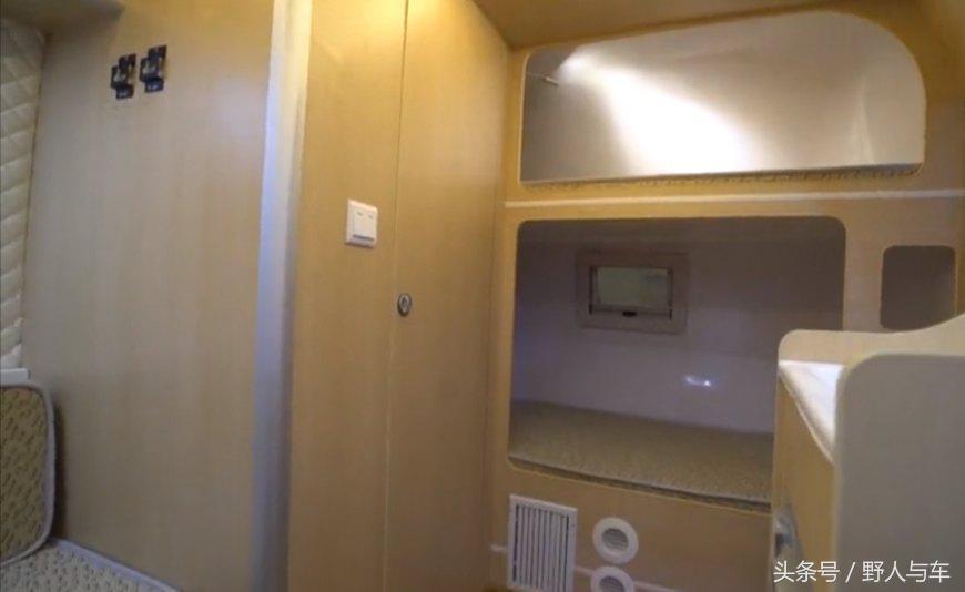 进入到房车内部,房车车门的右侧是一张上下铺,床的尺寸为2*0.83米,可以上下睡两个人。车门门口还有一个储物柜,可以用来放我们的鞋子,车门另一侧是一个小的厨房区域。