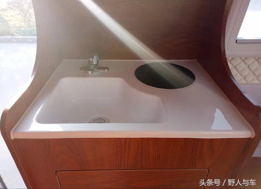 厨房区域内配备了一个洗菜池和一个1200w的电磁炉。出台下方则是一台12V的车载冰箱,冰箱不大,可以存放一些我们日常所需食物。厨台边上是一款可以这些都小桌板,可以放置我们的饭菜。