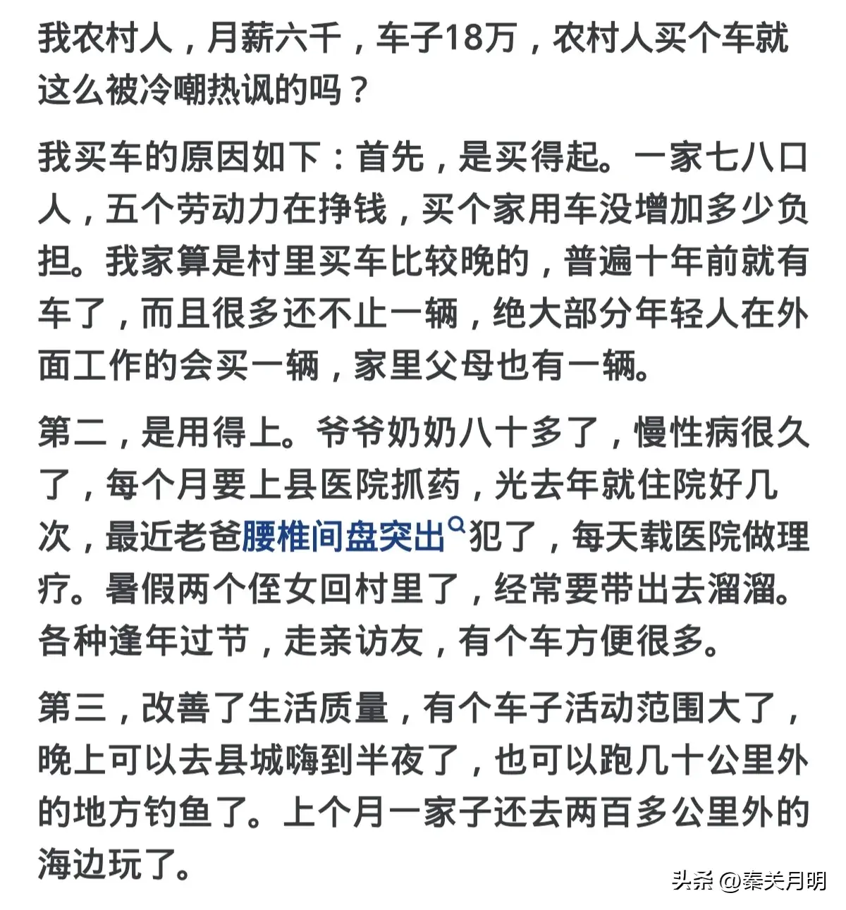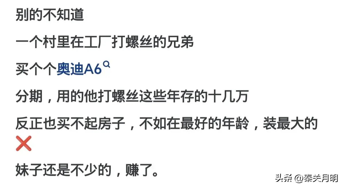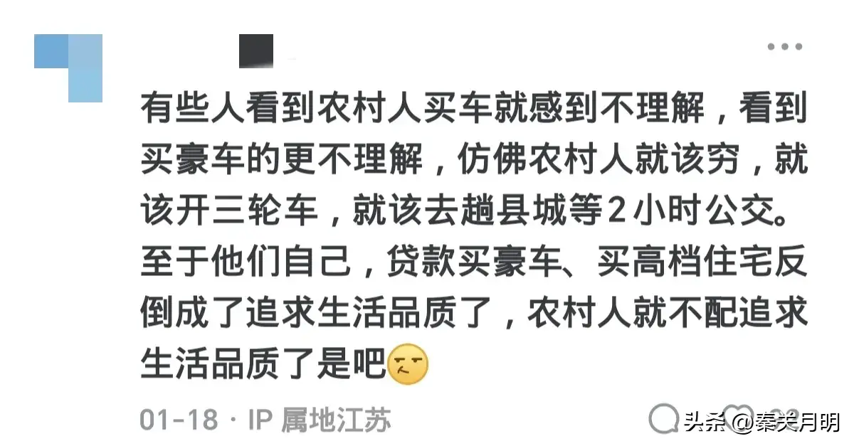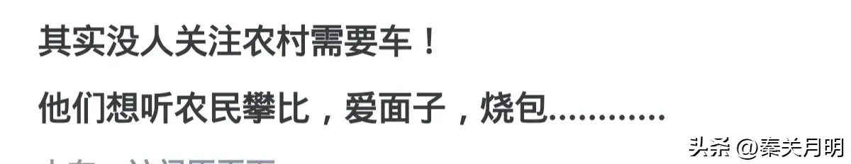 大家有没有发现一个现象,近几年越来越多的农村人开始买车了,就拿我们这边一个50人的小村庄来说,几乎家家都有一辆十万左右的车,这些车大多都是家里的年轻人在外打工赚钱买来的,倒不是我看不起他们,只是这些人一年到头能用这辆车的时候就只有过年的那几天,因为父母年迈也不会开车,其余时间车都是闲置的,那么是什么导致他们买车的呢?来看看网友们的回答。