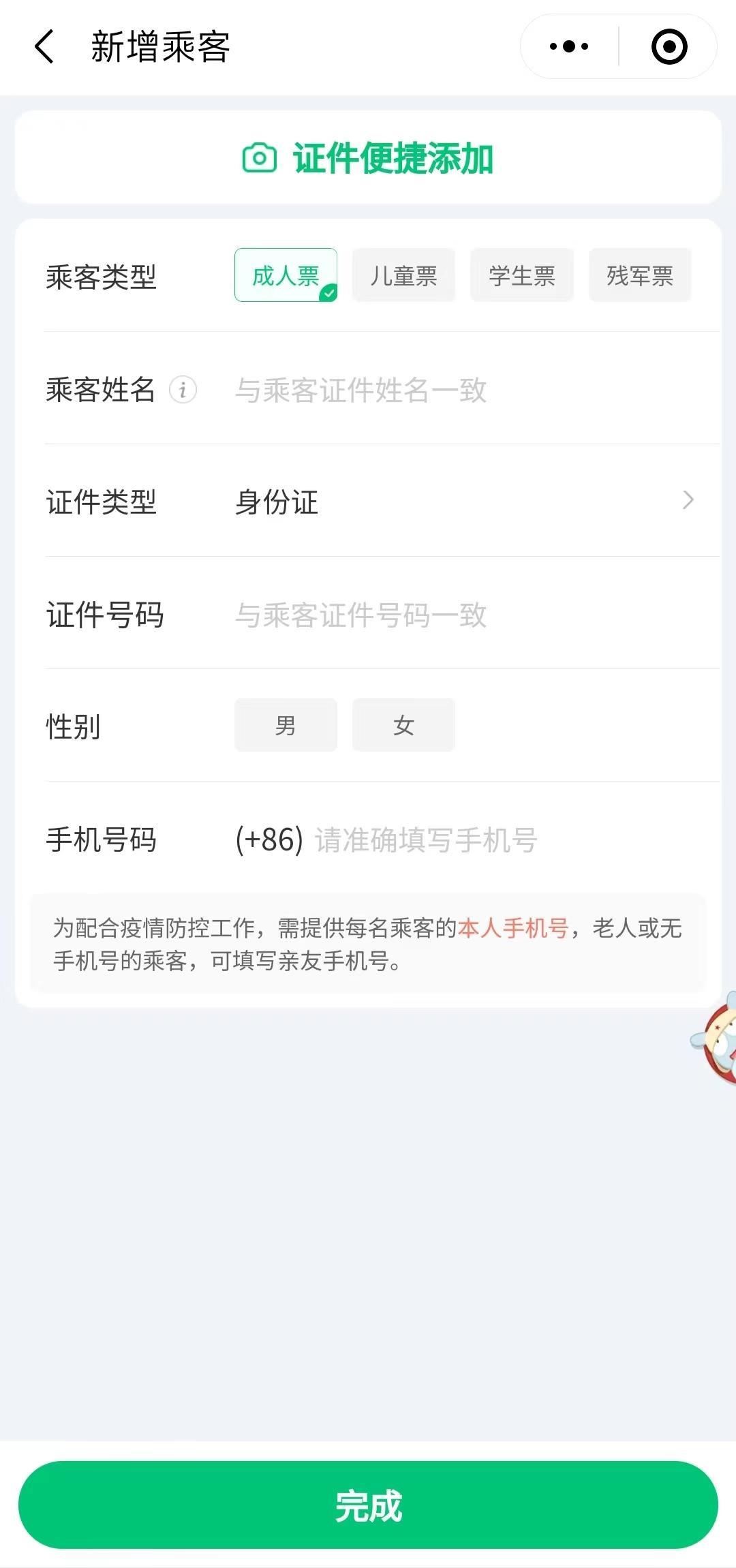 将乘客的信息填写完整,需要填写姓名,身份证号码,性别,手机号等。