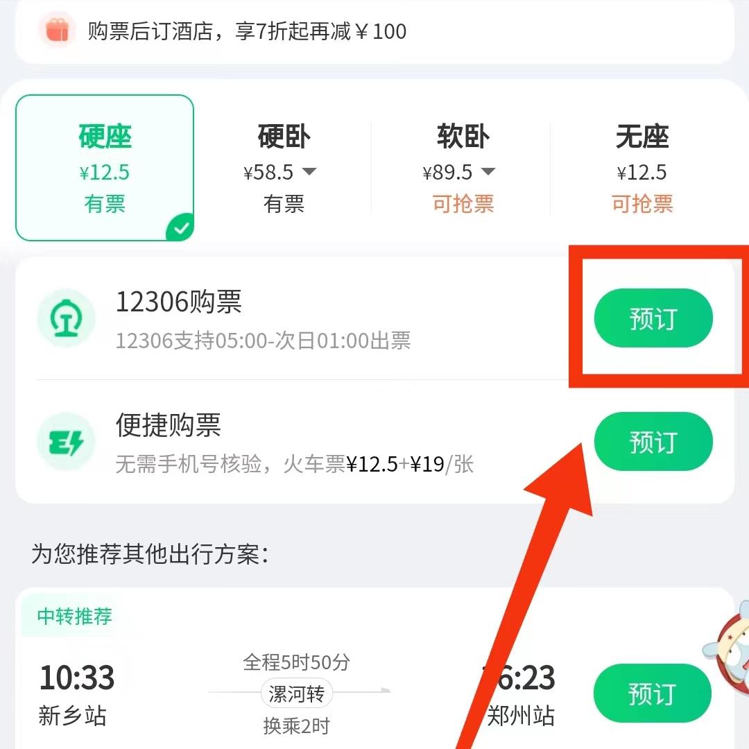 第六步:选择合适的火车班次,点击【预订】。便捷购票无需手机号核验,但是需要加19元的服务费,所以没有特殊情况我们就选择12306购票