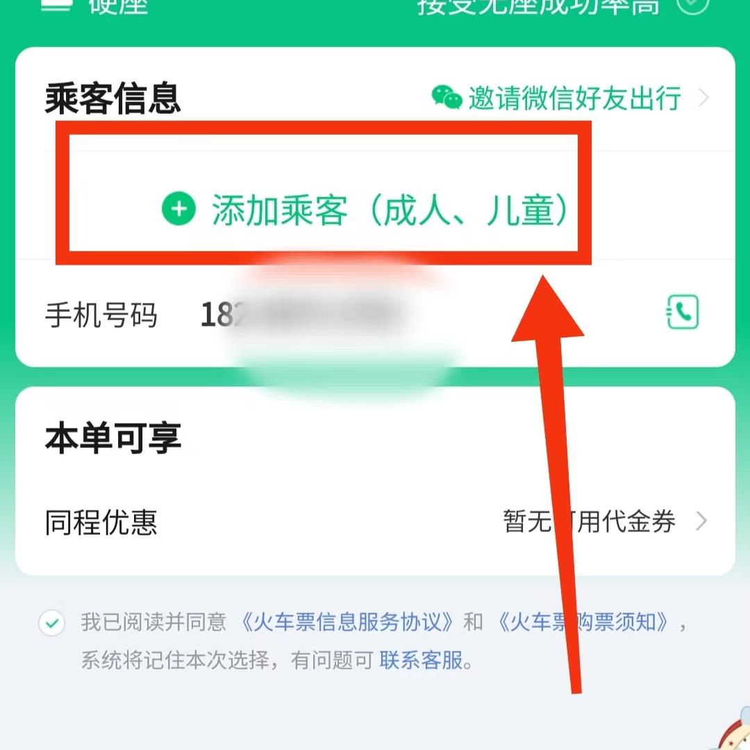 第十步:添加乘客信息,如果原来用过微信买票就可以直接显示不用添加了,如果没有乘客信息就需要首先添加乘客信息。