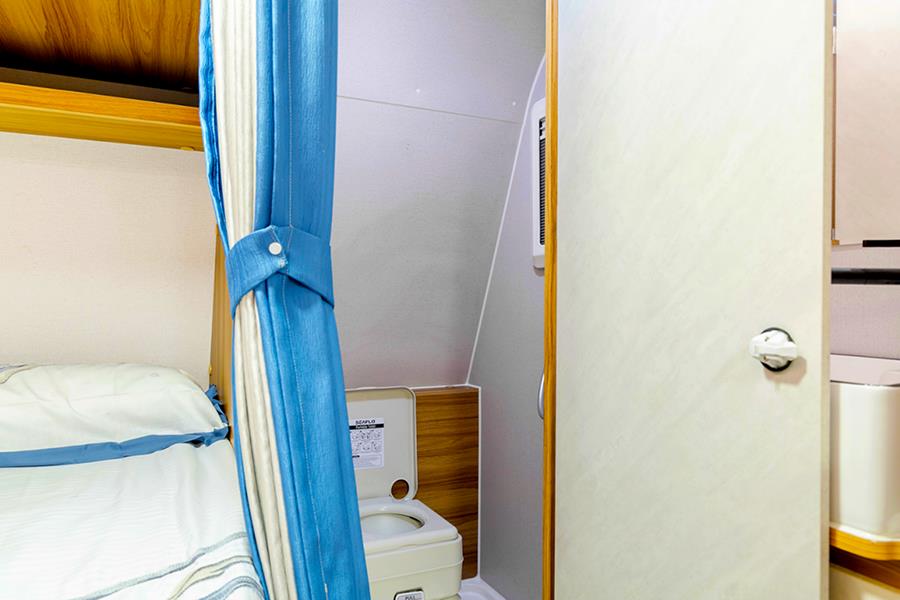 卫生间内部为了节约空间,搭配的便携式马桶,更多的空间被用来作淋浴房,热水系统采用的是一款28L家用储热式电热水器。水路标配120L净水箱和80L灰水箱,水箱容量上处于比较合理的状态。
