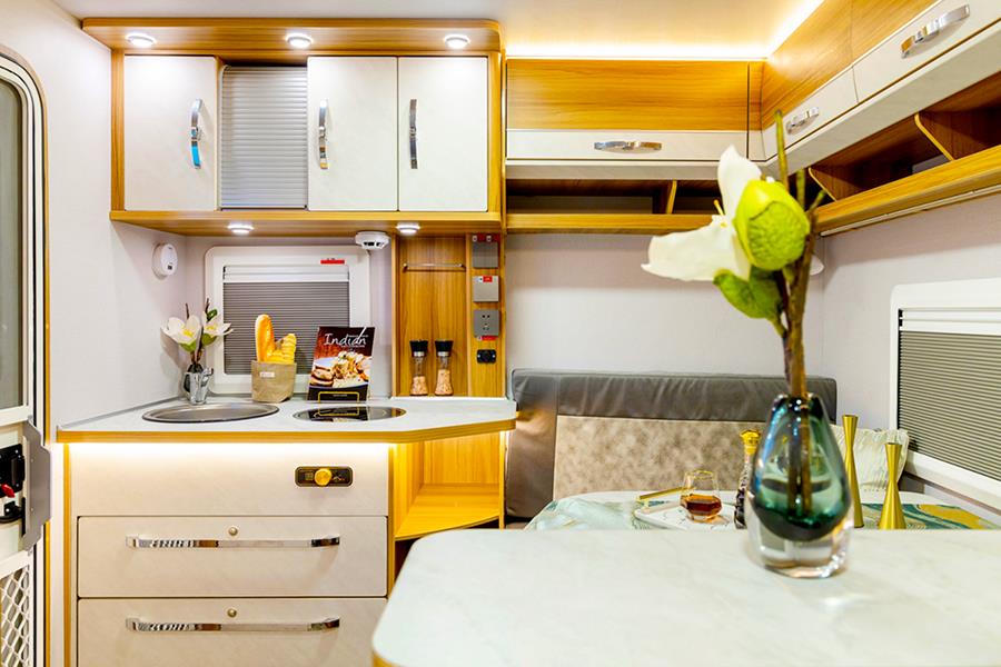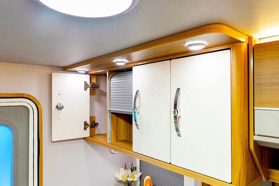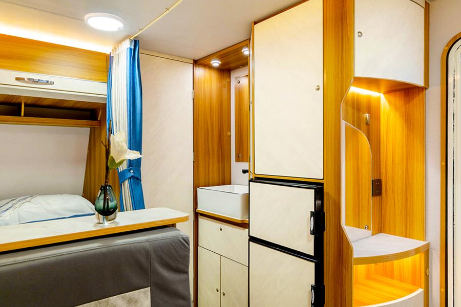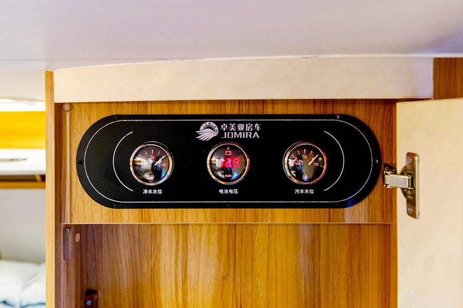 尾置厨房可操作空间更大,除了圆形不锈钢洗菜池和电磁炉,还有上下空间用来储物。整车没有总集成的控制面板,主灯开关都在厨房部分,个别小氛围灯和床头灯都在对应区域。