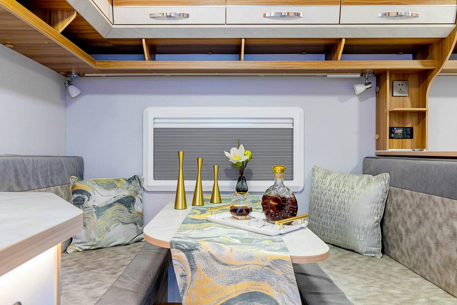 拖挂房车在行驶过程中是不能载人的,所以会客区并没有过多去迎合舒适性特意设计,总体感觉靠背略直。更重要的功能是,这里晚上可以拼成一张1900×1100(mm)的床铺。沙发的上下都是储物空间。