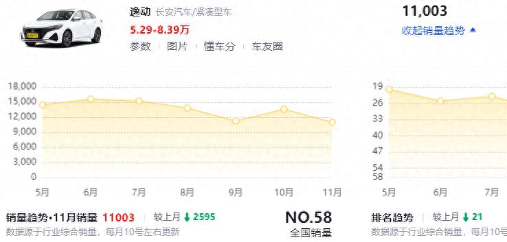 第一台车长安逸动PLUS,现在起步来到5.29万,顶配8.39万。除了性价比非常高之外,油耗非常低,空间又很大,比起一般的家用轿车大了一整圈,而且动力表现也是比较充足,最重点的是它的口碑很好,做工品质比较优秀!上个月又卖了1.1万台,销量是非常稳定,得到大部分车主所认可。