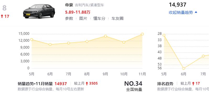 第三台车吉利帝豪,这台国产家用轿车,比起本田思域、丰田卡罗拉便宜了3万到4万左右!上个月又交付了14,937辆,现在最低裸车来到5.89万,顶配11.88万,它的高配车型并不是太推荐,它的低配还有中配,绝对是值得你看一看!这款车的做工品质燃油经济性,性价比配置丰富度,真的比同级别水平要更好一些,而且上个月名次又攀升了17个。