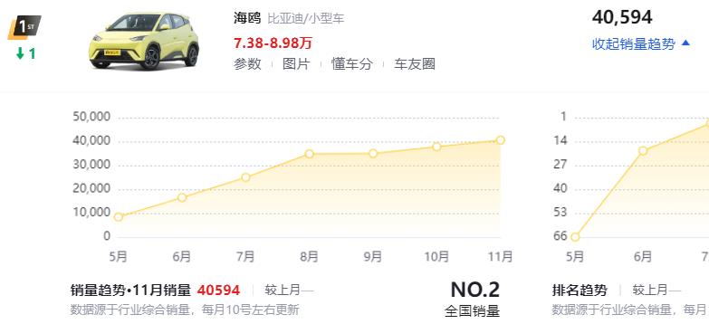 第五台车比亚迪海鸥,这款代步小车简直不要太火爆,那个销量增长趋势,简直像坐了火箭一样!上个月又交付了40,594辆,比起前几个月更猛。它的定位和五菱缤果是差不多,但是它的售价比五菱缤果要贵了很多,起步就是7.38万,顶配是8.98万,但是比亚迪海鸥续航里程比较长,起步305公里,长续航是405公里,全系标配快充,充满只需要0.5小时,而且稳定性非常好。