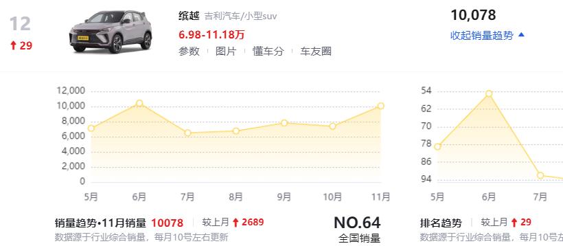 第二台车吉利缤越,新款车型外观设计的确比较霸气,内饰质感做的很好,口碑评价相当不错,最重点的是它性价比高!现在起步来到6.98万,顶配11.18万,上个月又卖出了1万多台,销量是蹭蹭上涨。新款车型搭载的还是新款的1.5T发动机,马力181匹,它毕竟老款的三缸发动机,性能强了很多,最重点是油耗还降低了。