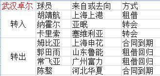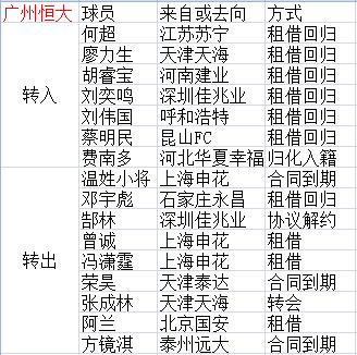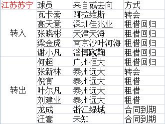 转出球员:何超(恒大)、张新林(泰州)、倪寅(泰州)、叶尔凡(泰州)、刘建业(泰州)、龙成(绿城)、汪嵩(待定)。