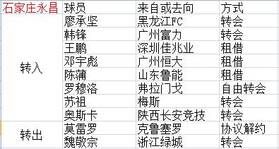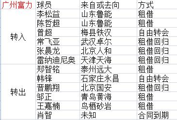 转出球员:姆比亚(申花)、郭田雨(鲁能)、常飞亚(富力)、陈骜(华夏)。