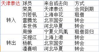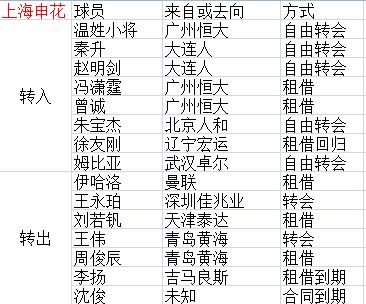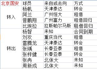 转出球员:买提江(上港)、潘喜明(华夏),杨帆(国安)。