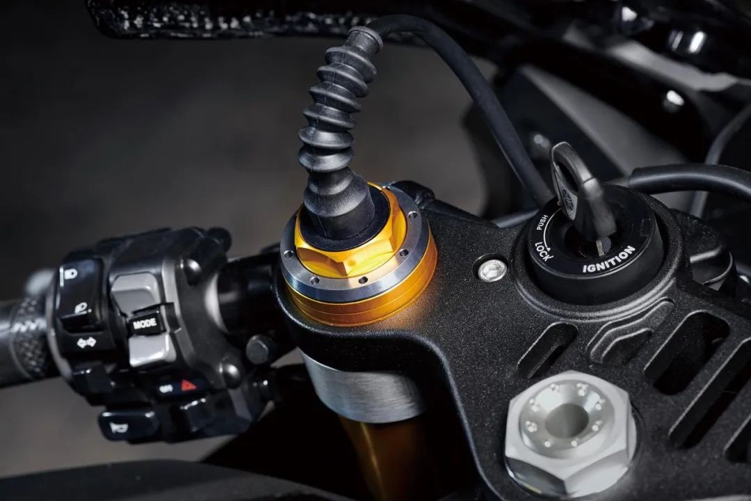 雅马哈R1M配备,ERS电控半主动悬架系统,采用43mm的Ohlins NPX倒立式前叉,带气囊的Ohlins中置后减震。