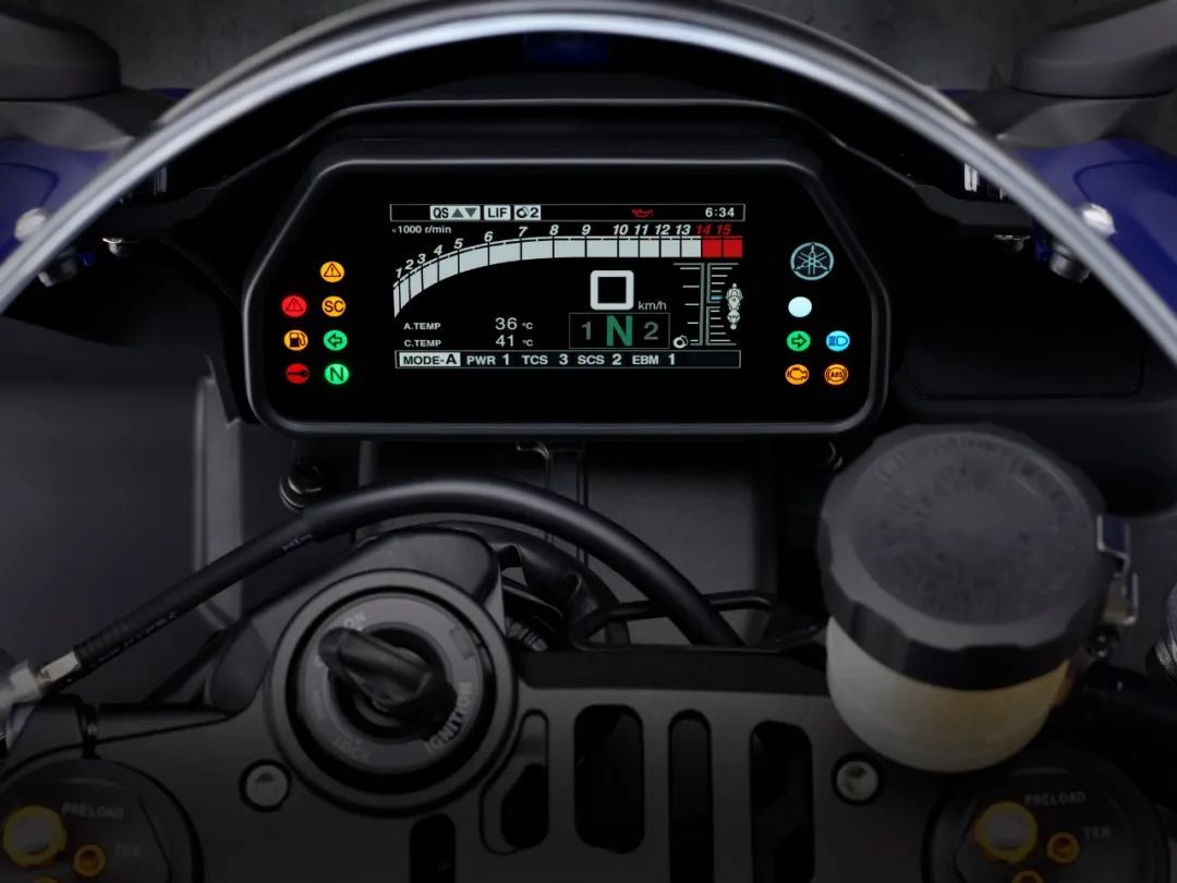 作为雅马哈的顶级车型,R1/R1M配备了功能丰富的4.2寸TFT仪表,提供六轴IMU惯性测量单元、功率模式、PWR和YRC雅马哈驾驶管理、TCS牵引力控制、SCS侧滑控制、LIF孤轮控制、LCS弹射起步、QSS双向快排、发动机制动控制等等。