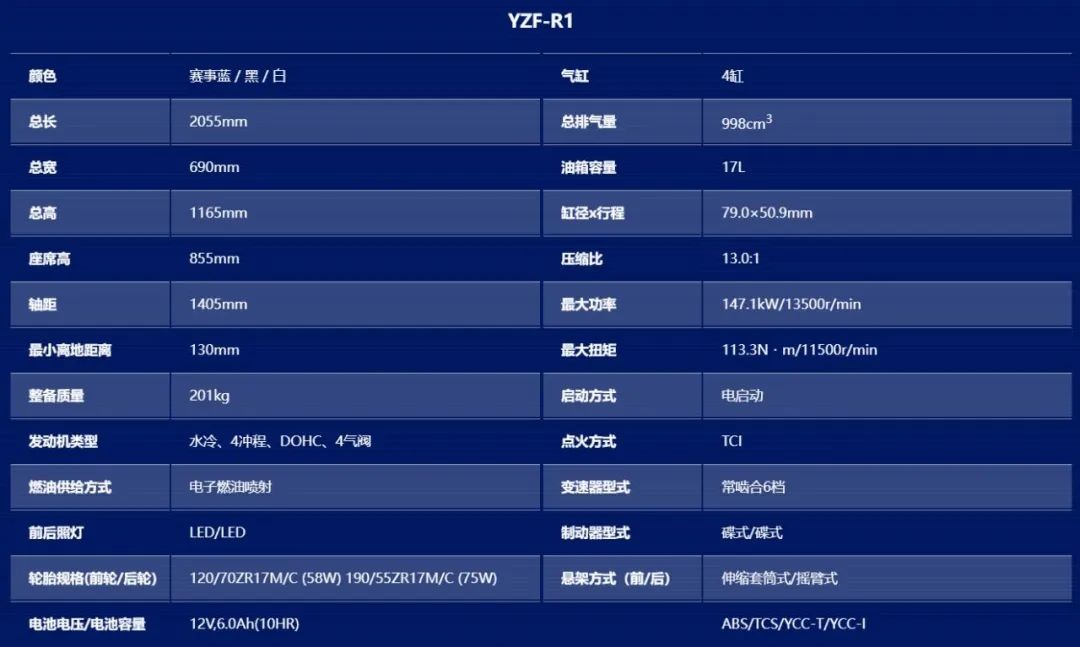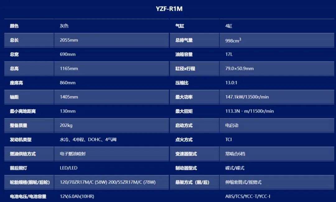 雅马哈此次引进的新款车型颜色分别为:R1M(灰色)、R1黑色、白色(60周纪念版涂装)、赛事蓝。