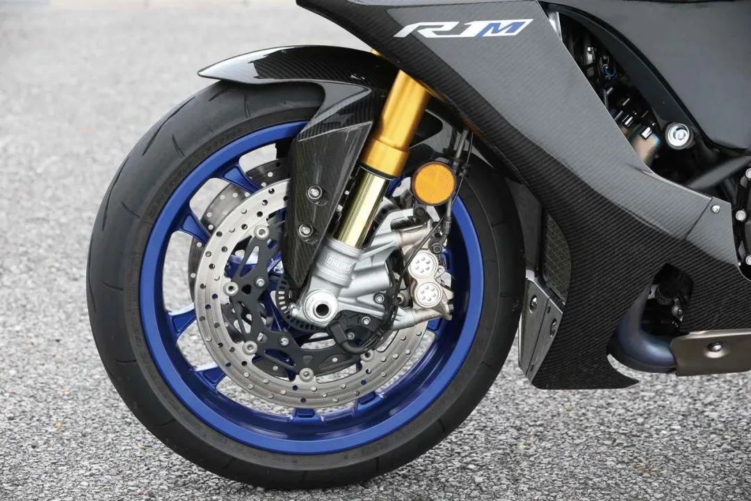刹车规格,R1和R1M保持一致,均采用前双320mm双浮动盘+双子星径向四活塞卡钳;后220mm单盘+Nissin单活塞卡钳,标配双通道ABS。