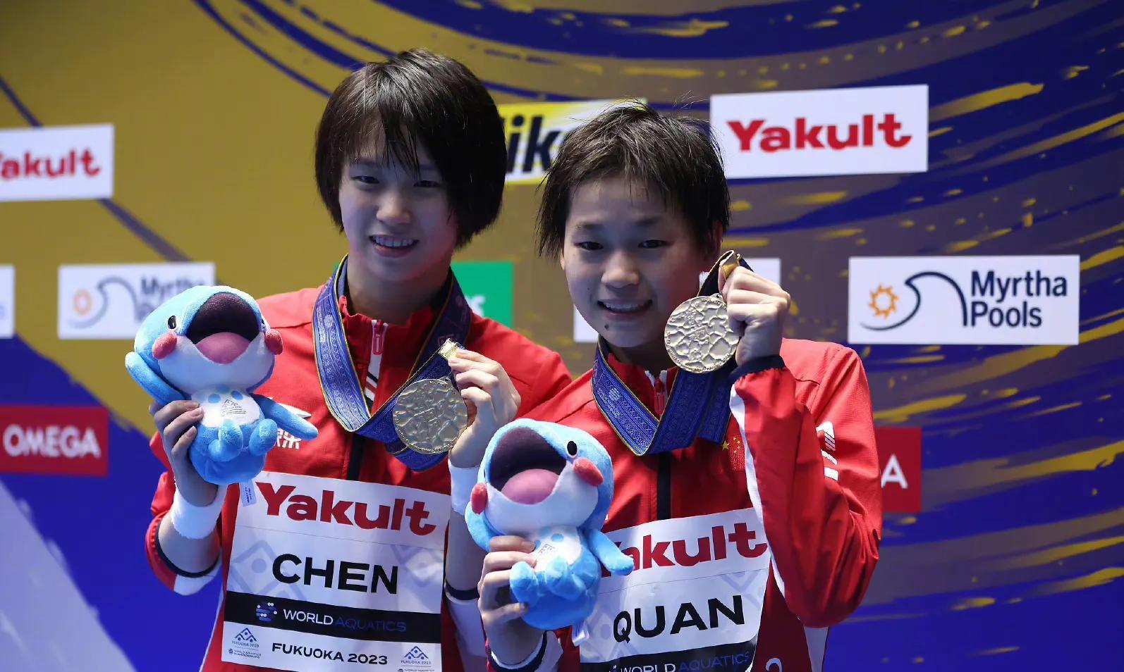 女子双人10米跳台决赛全红婵和陈芋汐一路领先,总成绩369.84分夺得金牌,这也是中国队本届世锦赛的第五枚金牌,同时两人成功获得该项目的2024年巴黎奥运会入场券。英国组合和美国组合分别获得银牌和铜牌。