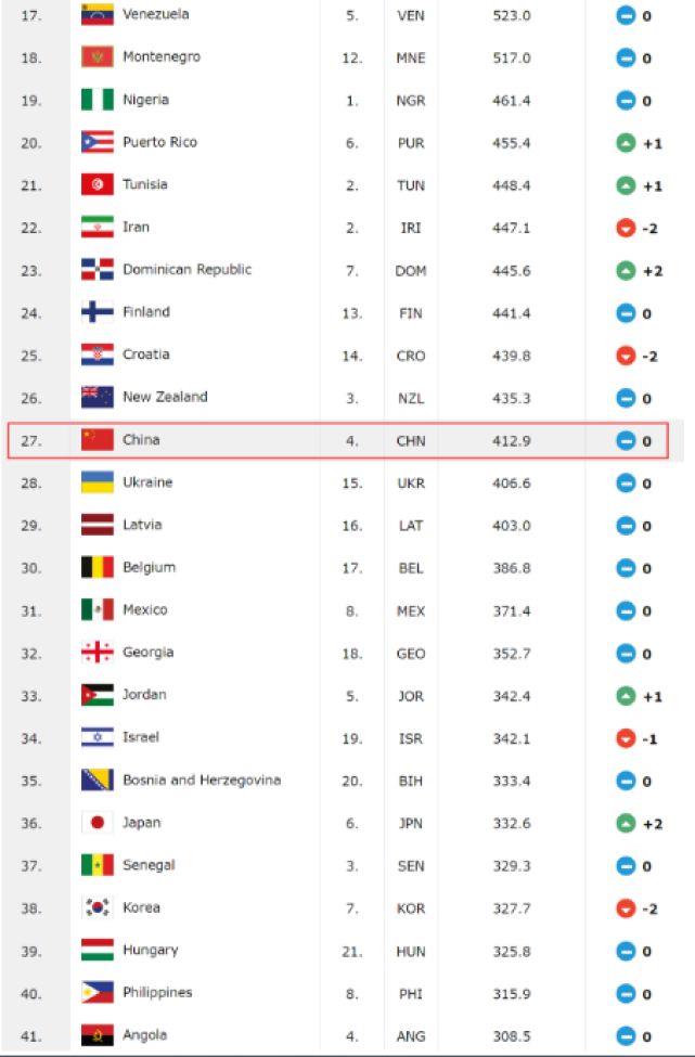 FIBA最新男篮排名:中国男篮世界第27亚大区第4 美国输西班牙第2